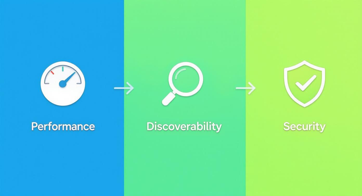 Beyond the look, feel, and cost, there are three massive technical factors that really decide whether your app sinks or swims: its performance, how secure it is, and how people actually find it in the first place. These are the foundations, and the differences between a web app and a mobile app are stark. Getting this choice right means properly understanding the trade-offs.